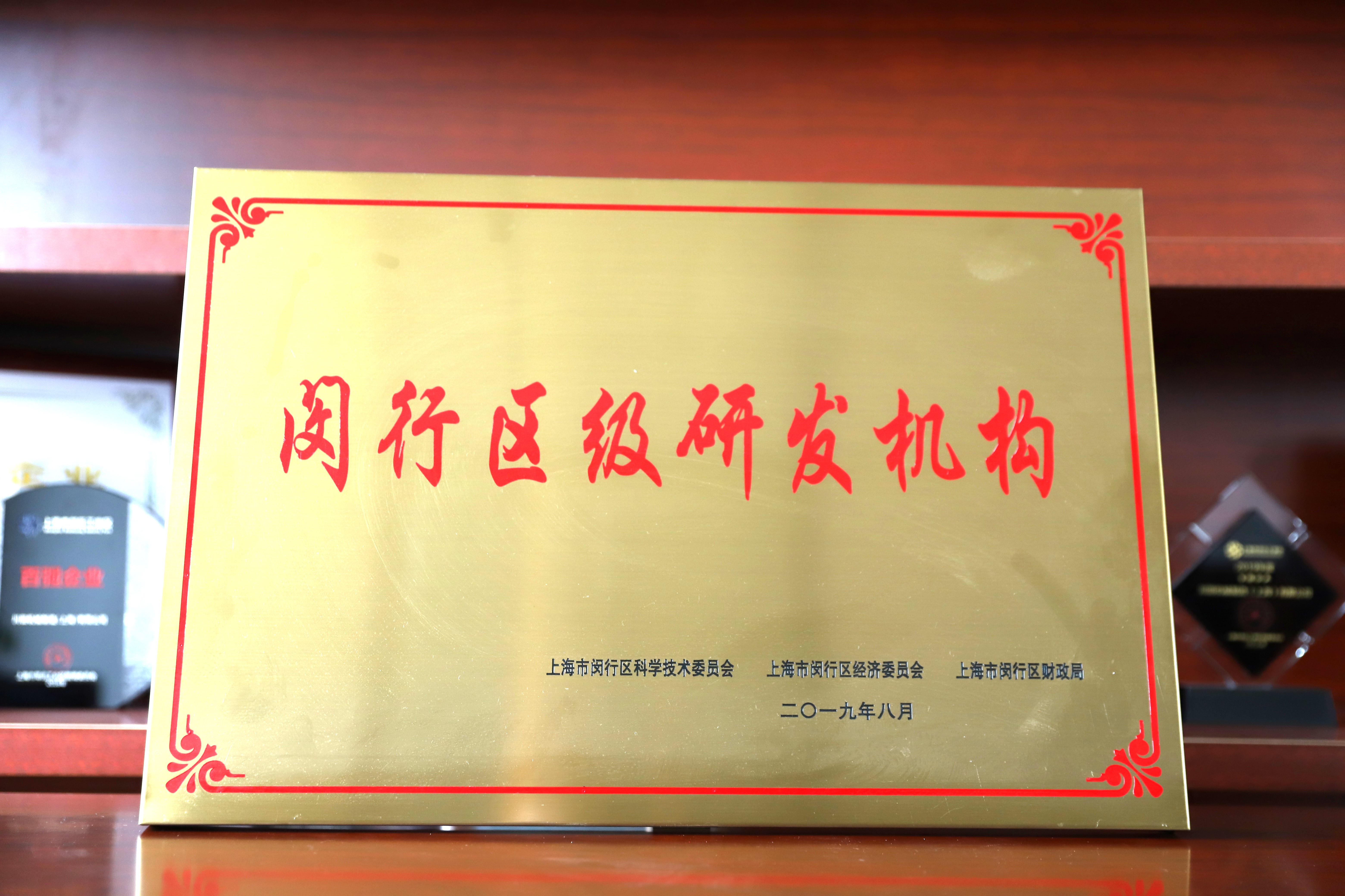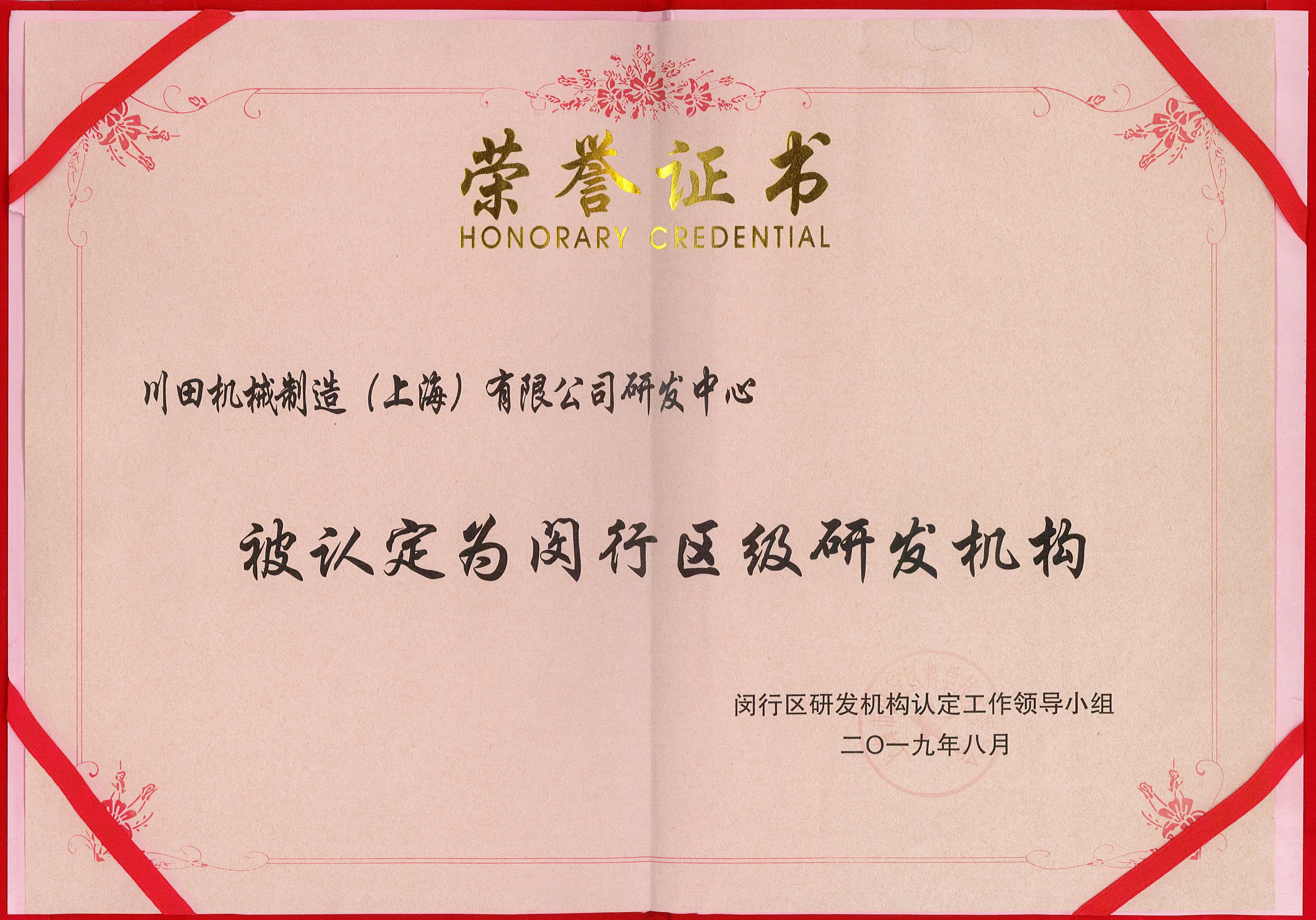 2019年度閔行區(qū)研究開発機構(gòu)証書